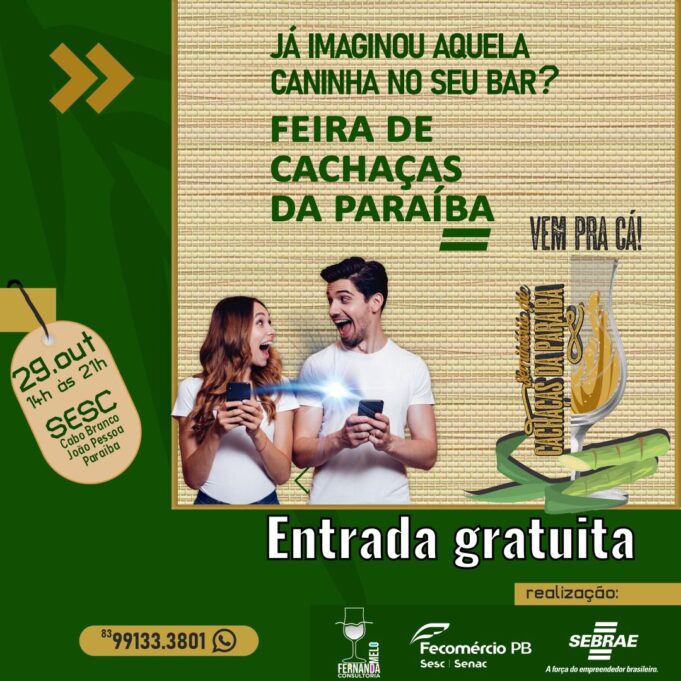 Será realizado, nos dias 28 e 29 de outubro, o I Seminário de Cachaças daParaíba e a I Feira de Cachaças da Paraíba, numa promoção do Sebrae PB, Fecomércio e Fernanda Melo Consultoria, com o apoio do Ibrac – Instituto Brasileiro da Cachaça, Aspeca – Associação Paraibana dos Engenhos de Cachaça de Alambique e Apca – Associação dos Produtores de Cachaça de Areia.