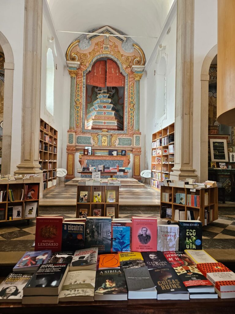 Uma outra atração é a livraria que é na antiga e linda Igreja de Santiago. Livros em toda a parte e até no altar. Olhe pela janela e veja a vista. A Praça de Santa Maria tem um pelourinho e a Igreja do mesmo nome.