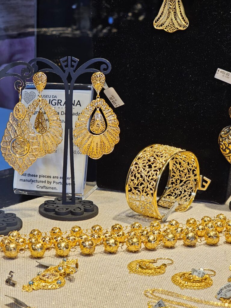 As lojinhas vendem todos os tipos de produtos, geralmente artesanais: muita roupa de linho, bordados, itens de alimentação como defumados, queijos e as famosas sardinhas e bacalhaus em latas que parecem um presente, de tão lindas. Entre os acessórios de adorno destaque para a famosa loja de brincos e pulseiras em filigrana, uma técnica ancestral manual que utiliza fios de ouro ou prata para criar jóias impressionantes.(RosaAguiar)